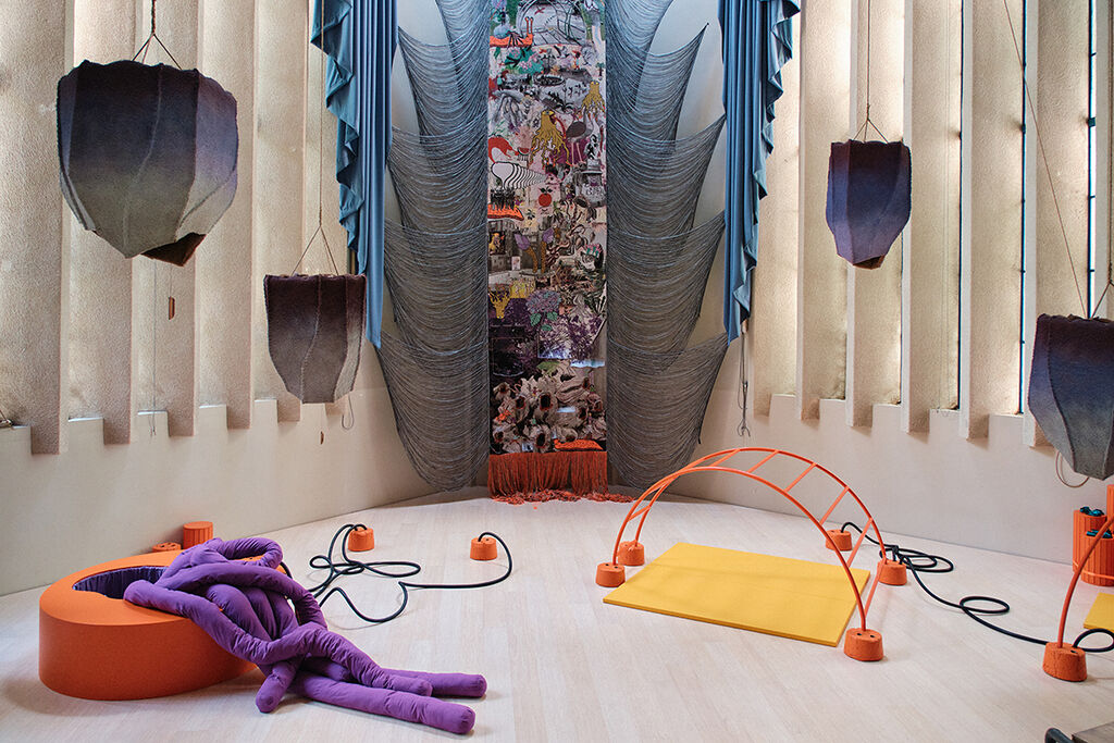 A scenographic exhibition where play is approached as invention, disobedience, and creation of shared space. The installation unfolds as an immersive ecosystem with modular sculptural costumes, a large wall tapestry, and play structures. Visitors—children and adults alike—are invited to co-compose stories, gestures, and sounds. The project includes a public programme of playshops (storytelling, weaving, sound, gardening) led by artists, and a symposium, The Magic Circle: Playing Outside Time.